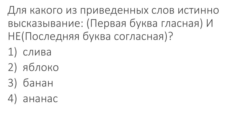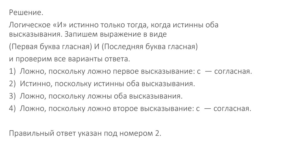 4) Ложно, поскольку ложно второе высказывание: с — согласная.
