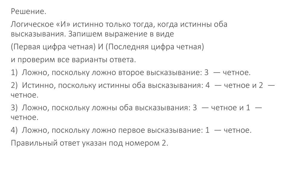Решение. Логическое «И» истинно только тогда, когда истинны обавысказывания. Запишем выражение в виде