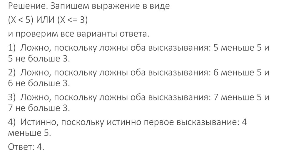 Решение. Запишем выражение в виде(X < 5) ИЛИ (X <= 3)