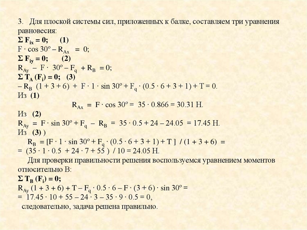 3. Для плоской системы сил, приложенных к балке, составляем три уравненияравновесия: