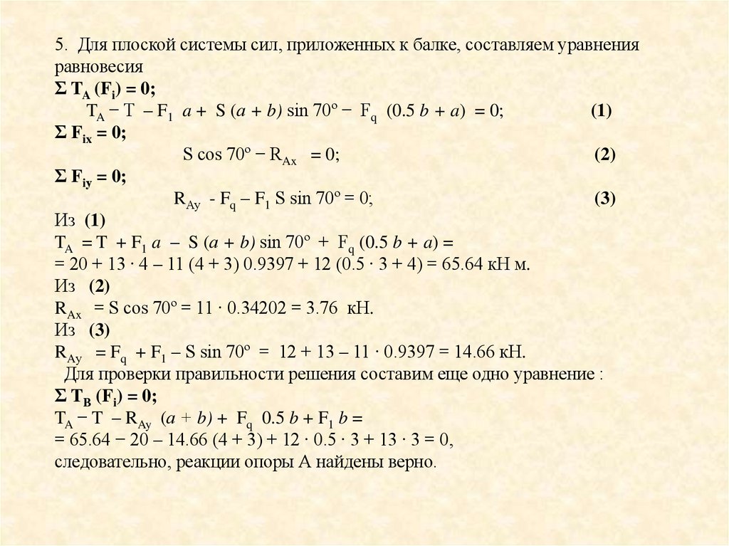5. Для плоской системы сил, приложенных к балке, составляем уравненияравновесия