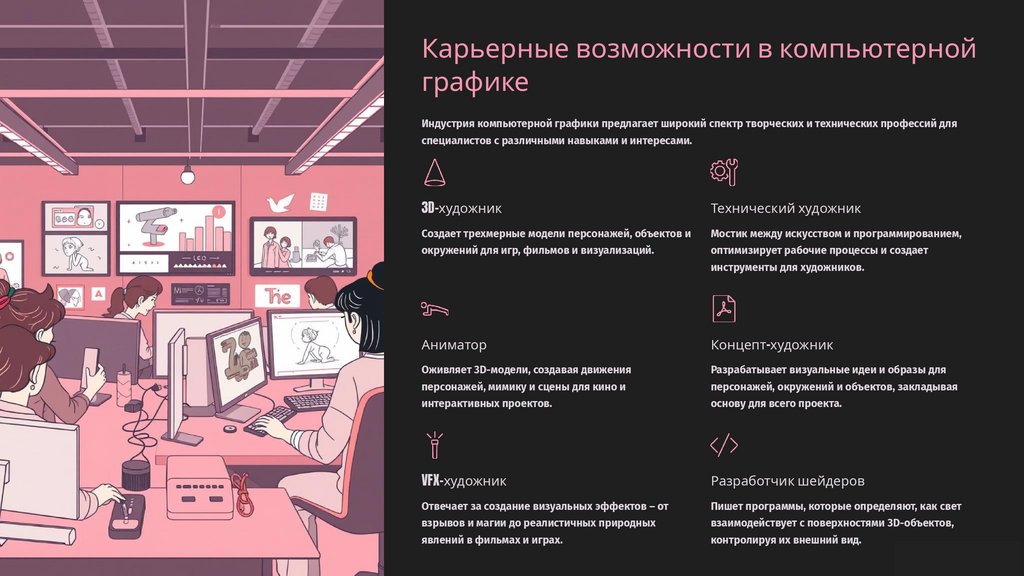 Индустрия компьютерной графики предлагает широкий спектр творческих и технических профессий для