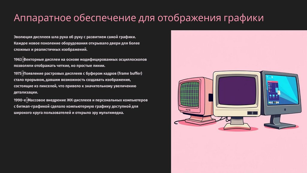 Аппаратное обеспечение для отображения графикиЭволюция дисплеев шла рука об руку с развитием самой графики.