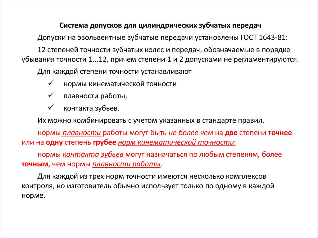 Система допусков для цилиндрических зубчатых передачДопуски на эвольвентные зубчатые передачи установлены ГОСТ 1643-81: