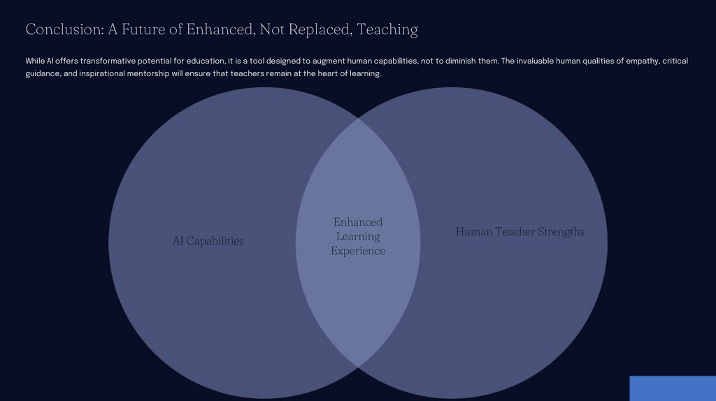 Conclusion: A Future of Enhanced, Not Replaced, TeachingWhile AI offers transformative potential for education, it is a tool designed to augment human capabilities, not to diminish them. The invaluable human qualities of empathy, critical