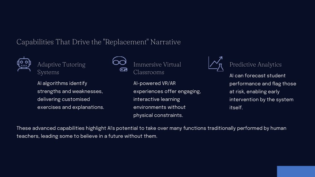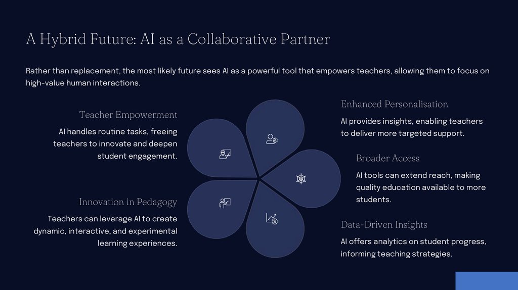 A Hybrid Future: AI as a Collaborative PartnerRather than replacement, the most likely future sees AI as a powerful tool that empowers teachers, allowing them to focus on