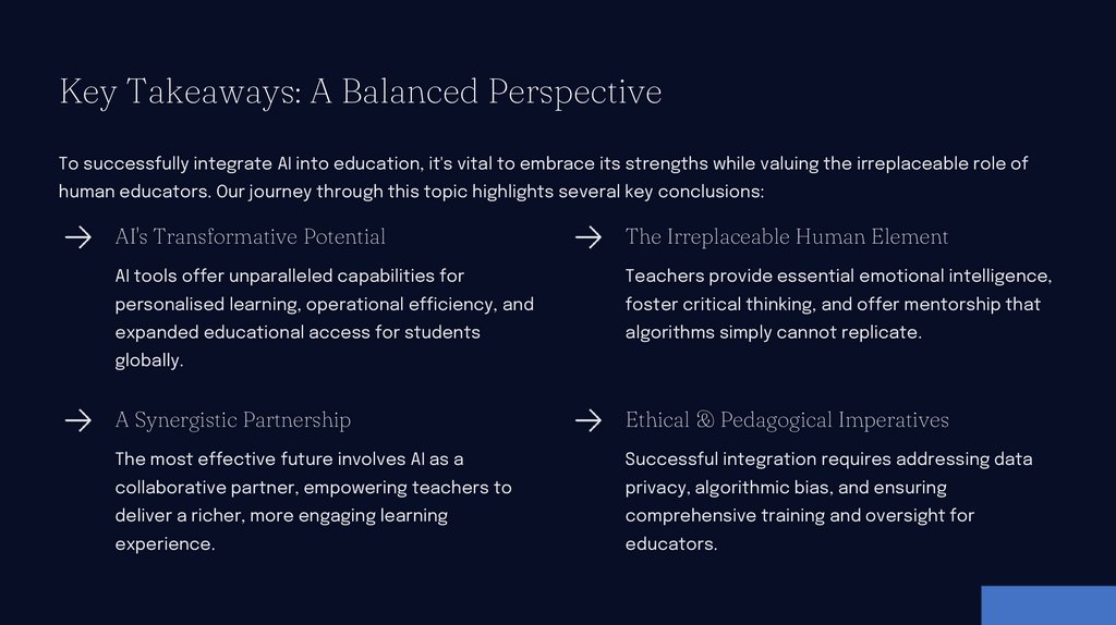 Key Takeaways: A Balanced PerspectiveTo successfully integrate AI into education, it's vital to embrace its strengths while valuing the irreplaceable role of