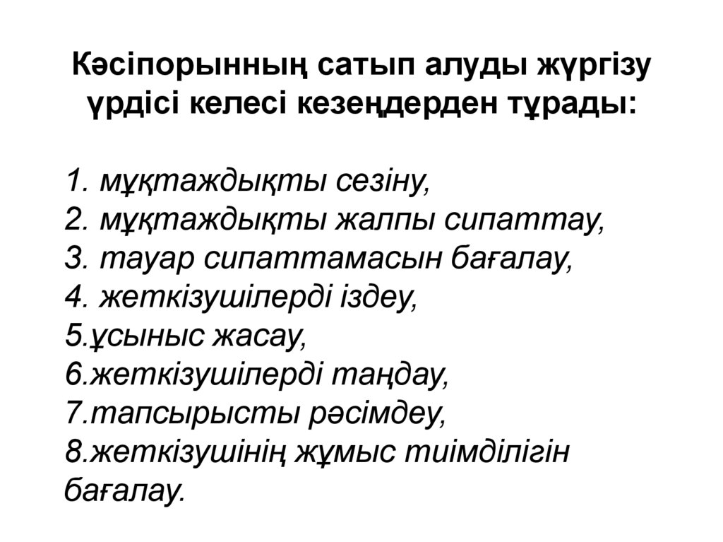 Кәсіпорынның сатып алуды жүргізуүрдісі келесі кезеңдерден тұрады: