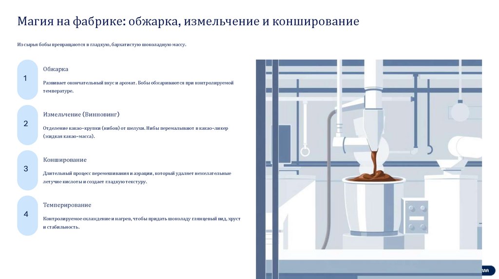 Магия на фабрике: обжарка, измельчение и коншированиеИз сырья бобы превращаются в гладкую, бархатистую шоколадную массу.