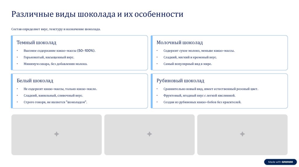 Различные виды шоколада и их особенностиСостав определяет вкус, текстуру и назначение шоколада.