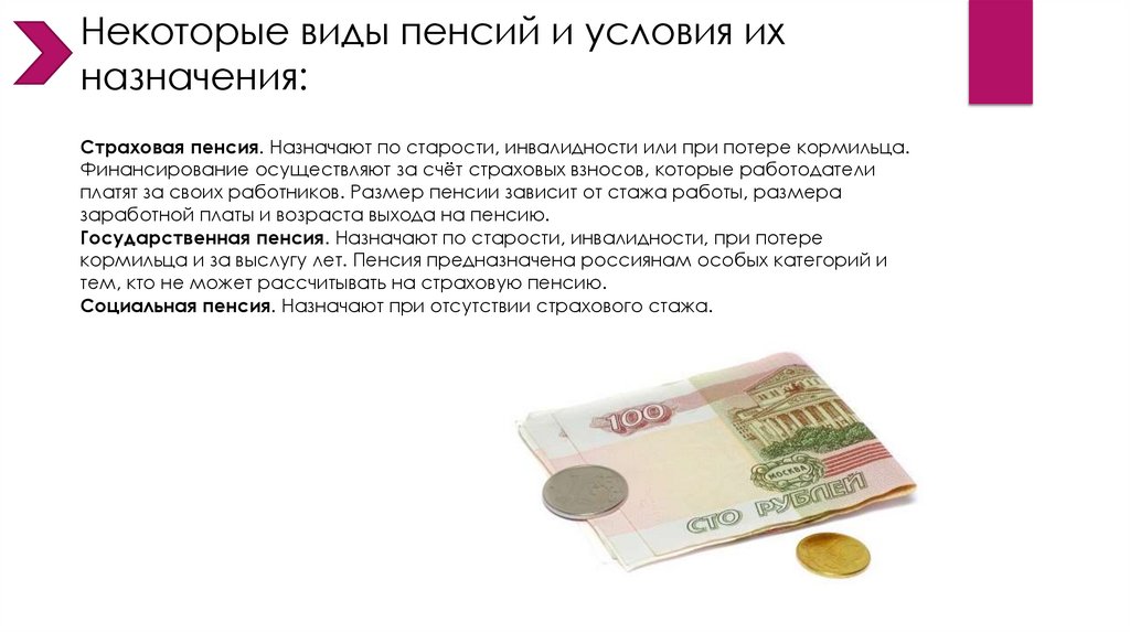 Некоторые виды пенсий и условия ихназначения: