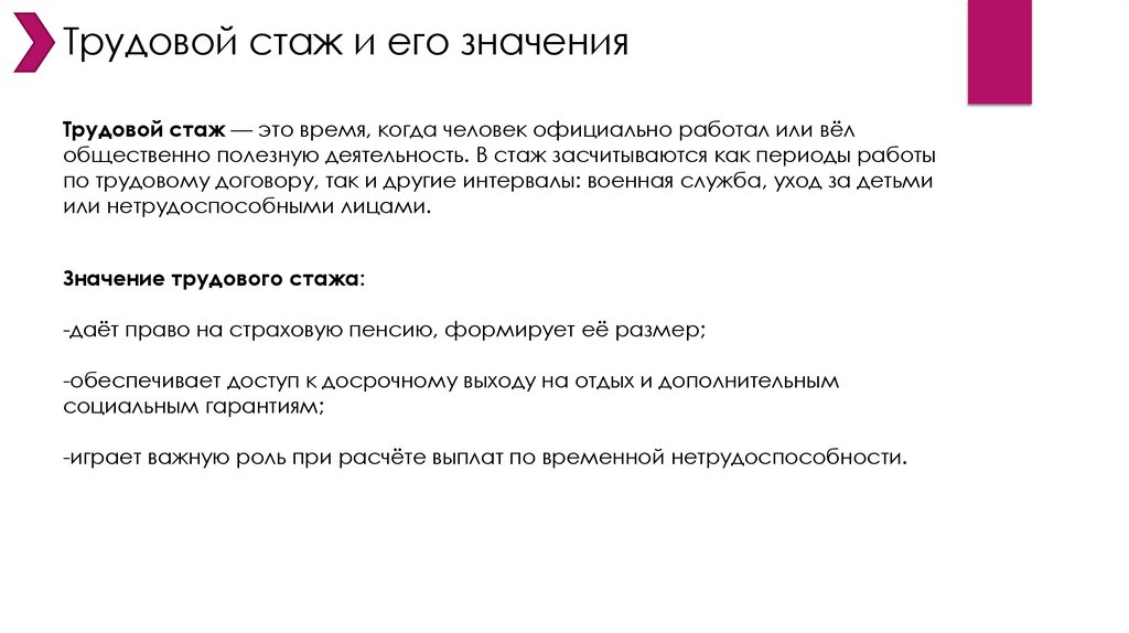 Трудовой стаж и его значенияТрудовой стаж — это время, когда человек официально работал или вёл