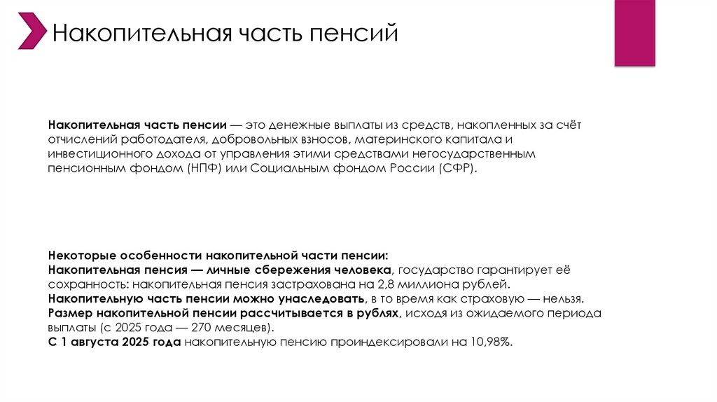 Накопительная часть пенсийНакопительная часть пенсии — это денежные выплаты из средств, накопленных за счёт