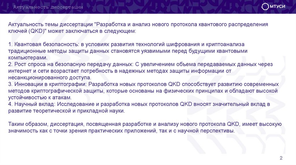 Таким образом, диссертация, посвященная разработке и анализу нового протокола QKD, имеет высокую