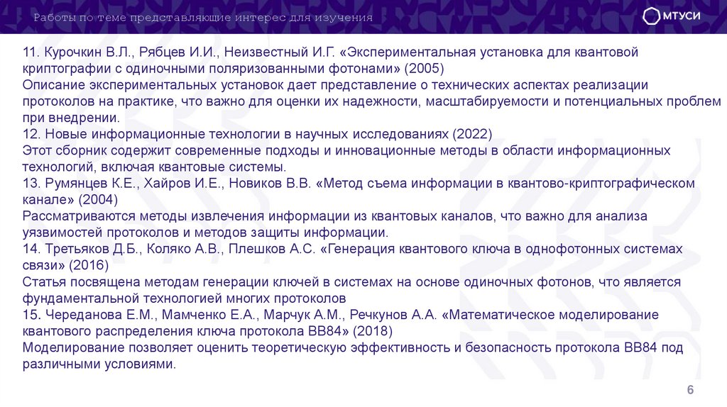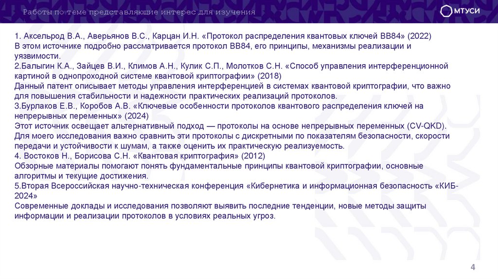 Работы по теме представляющие интерес для изучения1. Аксельрод В.А., Аверьянов В.С., Карцан И.Н. «Протокол распределения квантовых ключей ВВ84» (2022)