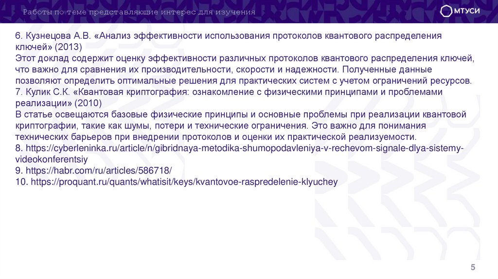 Работы по теме представляющие интерес для изучения6. Кузнецова А.В. «Анализ эффективности использования протоколов квантового распределения