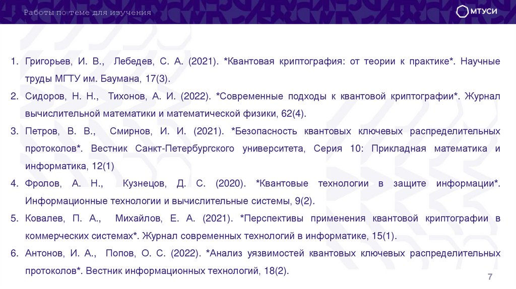 Работы по теме для изучения1. Григорьев, И. В., Лебедев, С. А. (2021). *Квантовая криптография: от теории к практике*. Научные