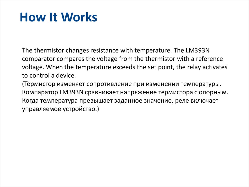 How It WorksThe thermistor changes resistance with temperature. The LM393N