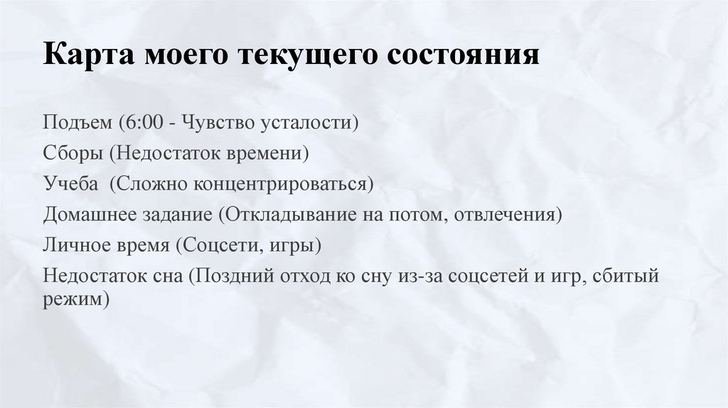 Карта моего текущего состоянияПодъем (6:00 - Чувство усталости)