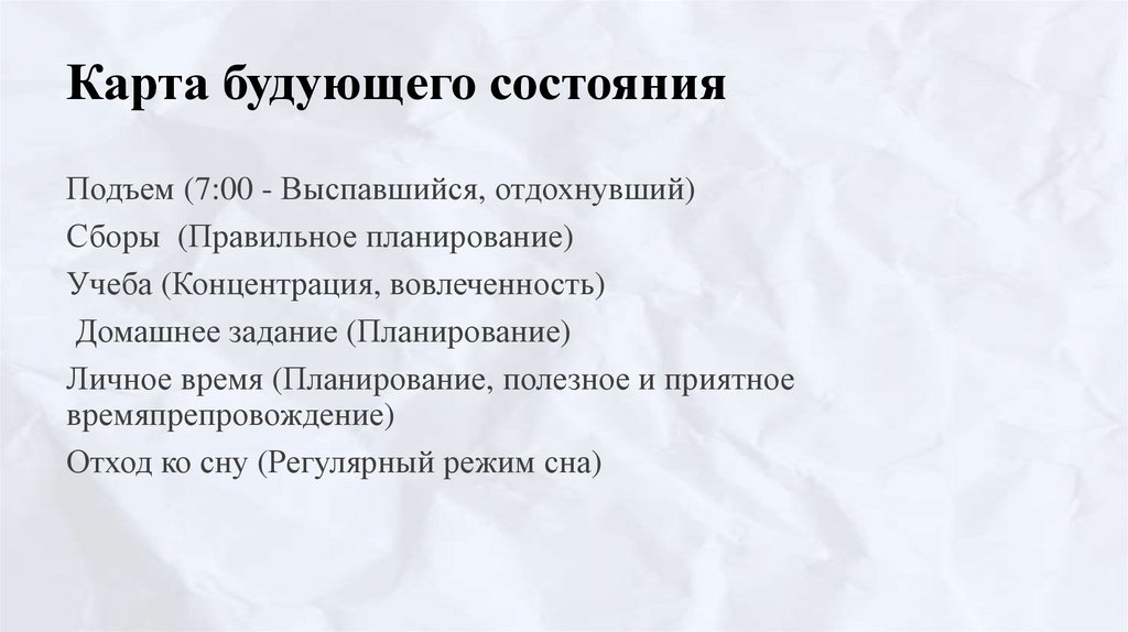 Карта будующего состоянияПодъем (7:00 - Выспавшийся, отдохнувший)