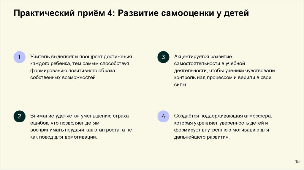 Практический приём 4: Развитие самооценки у детейУчитель выделяет и поощряет достижения