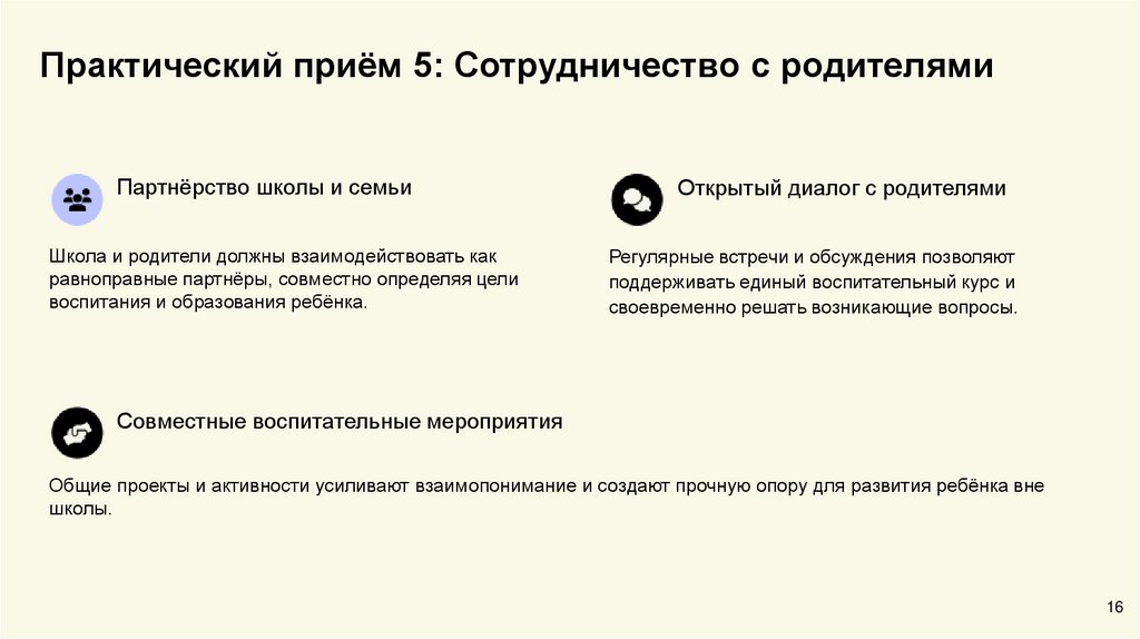 Практический приём 5: Сотрудничество с родителямиПартнёрство школы и семьи