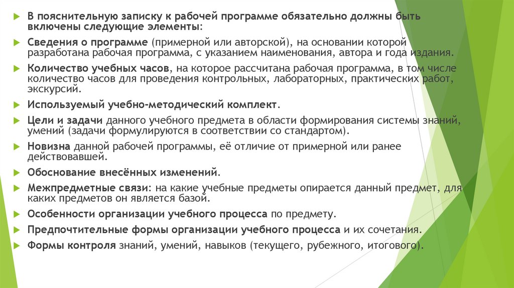 В пояснительную записку к рабочей программе обязательно должны бытьвключены следующие элементы: