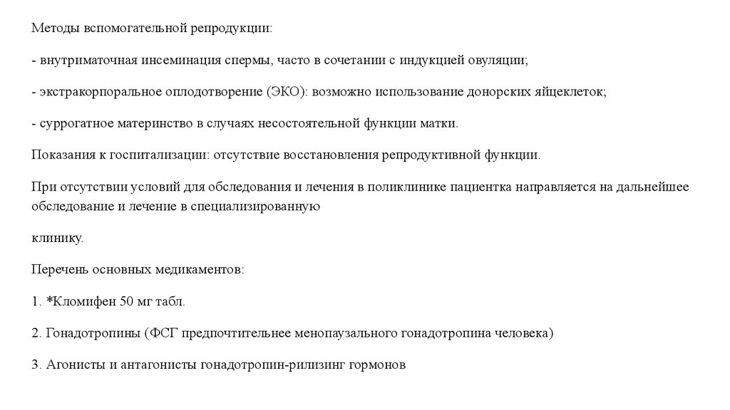 Методы вспомогательной репродукции:- внутриматочная инсеминация спермы, часто в сочетании с индукцией овуляции;
