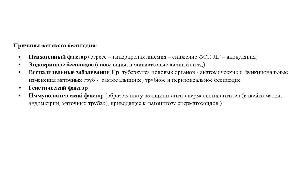 Причины женского бесплодия:Психогенный фактор (стресс – гиперпролактинемия – снижение ФСГ, ЛГ – ановуляция)