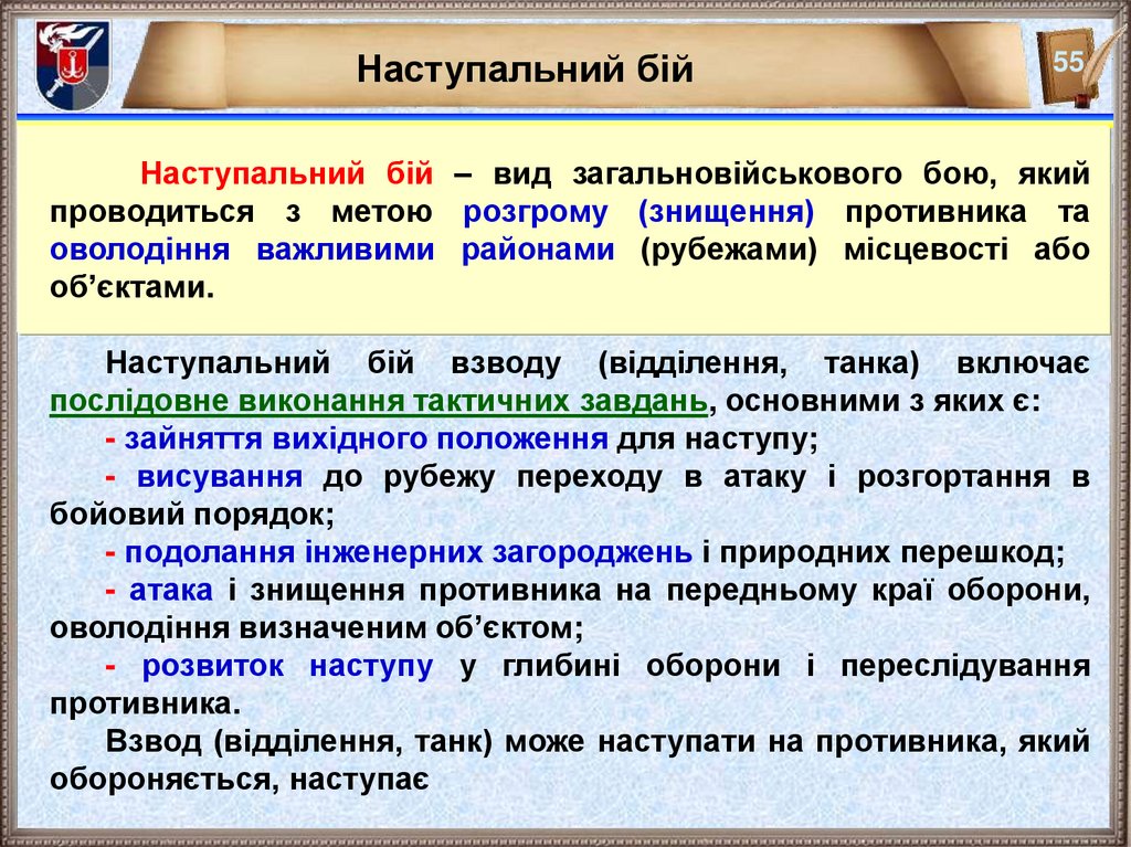 місцевості; нарощування зусиль у ході бою і можливість здійснення