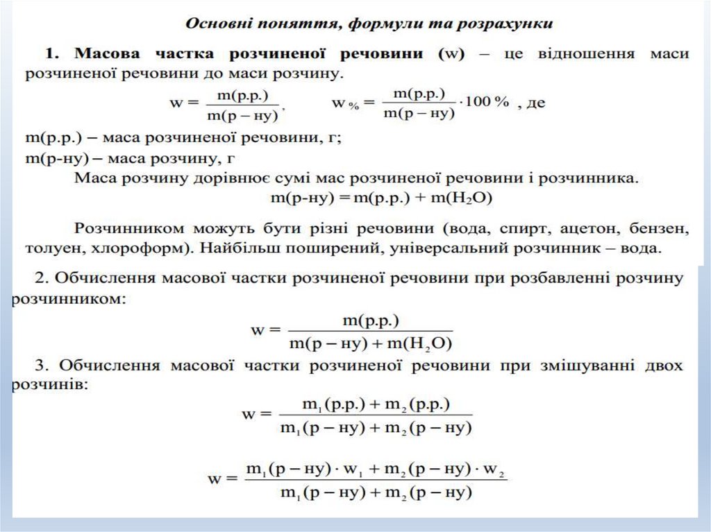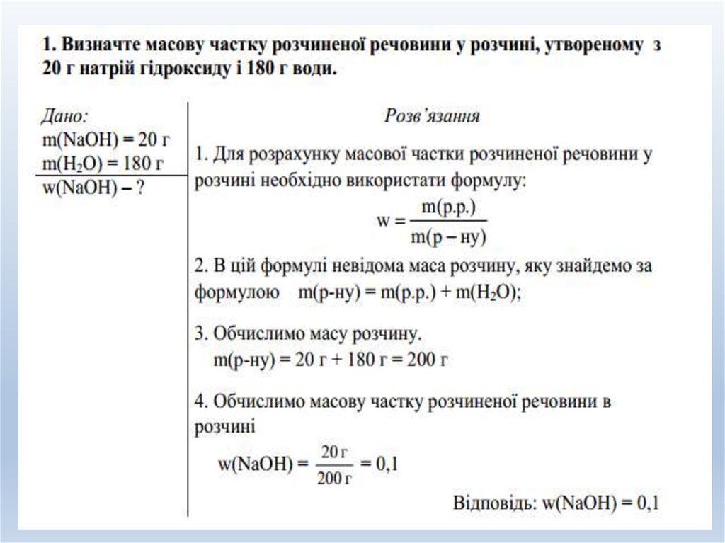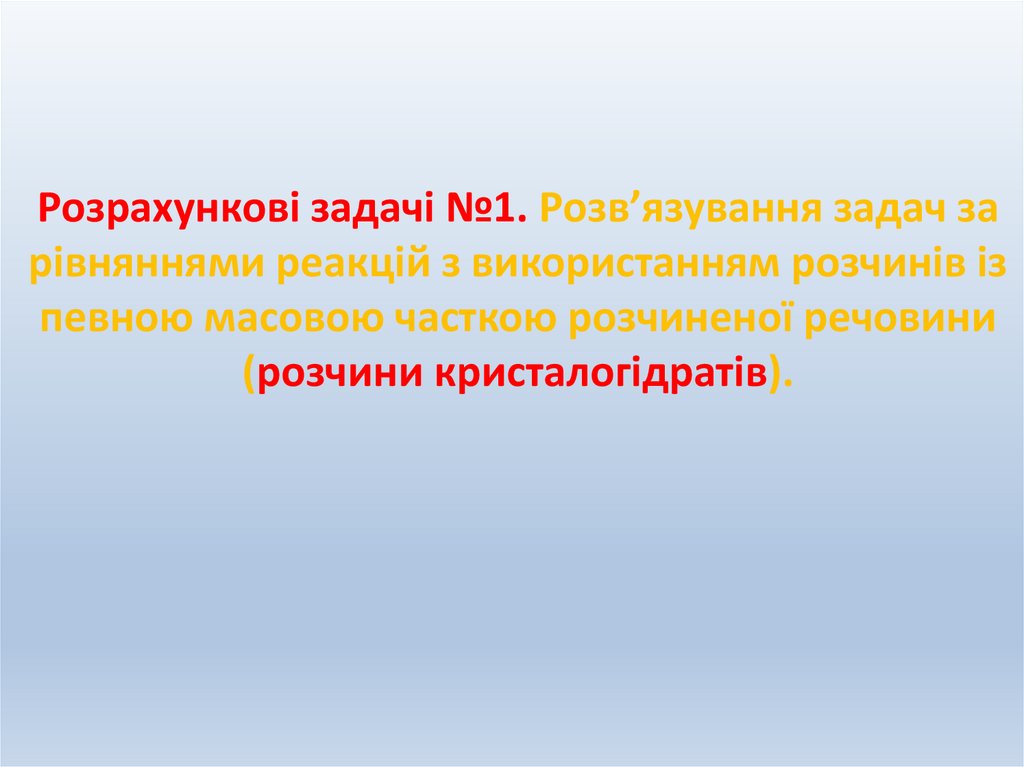 1. Розрахункові задачі №1. Розв’язування задач за рівняннями реакцій з використанням розчинів із певною масовою часткою розчиненої