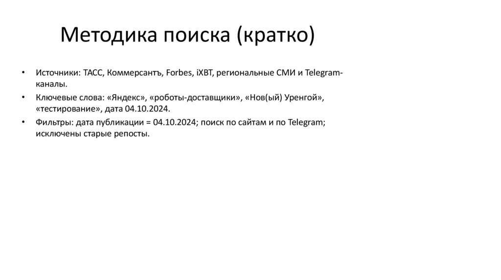 Методика поиска (кратко)Источники: ТАСС, Коммерсантъ, Forbes, iXBT, региональные СМИ и Telegramканалы.