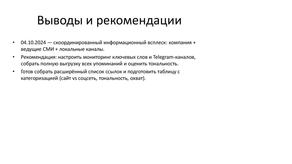 Выводы и рекомендации04.10.2024 — скоординированный информационный всплеск: компания +