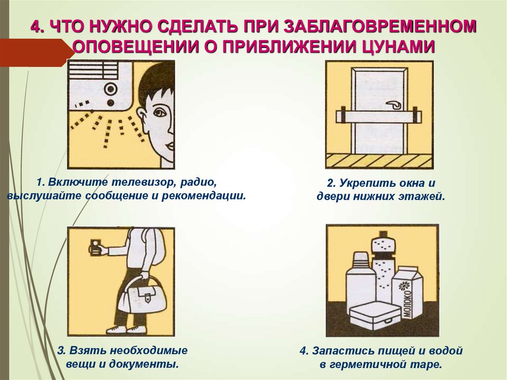 4. ЧТО НУЖНО СДЕЛАТЬ ПРИ ЗАБЛАГОВРЕМЕННОМОПОВЕЩЕНИИ О ПРИБЛИЖЕНИИ ЦУНАМИ