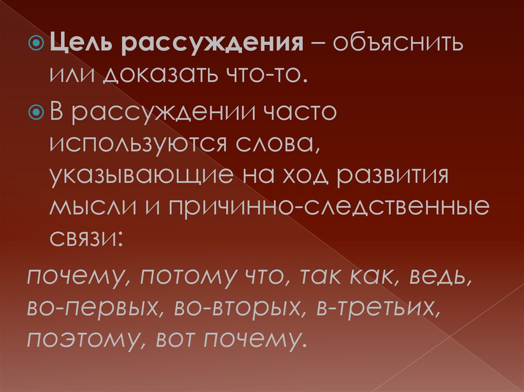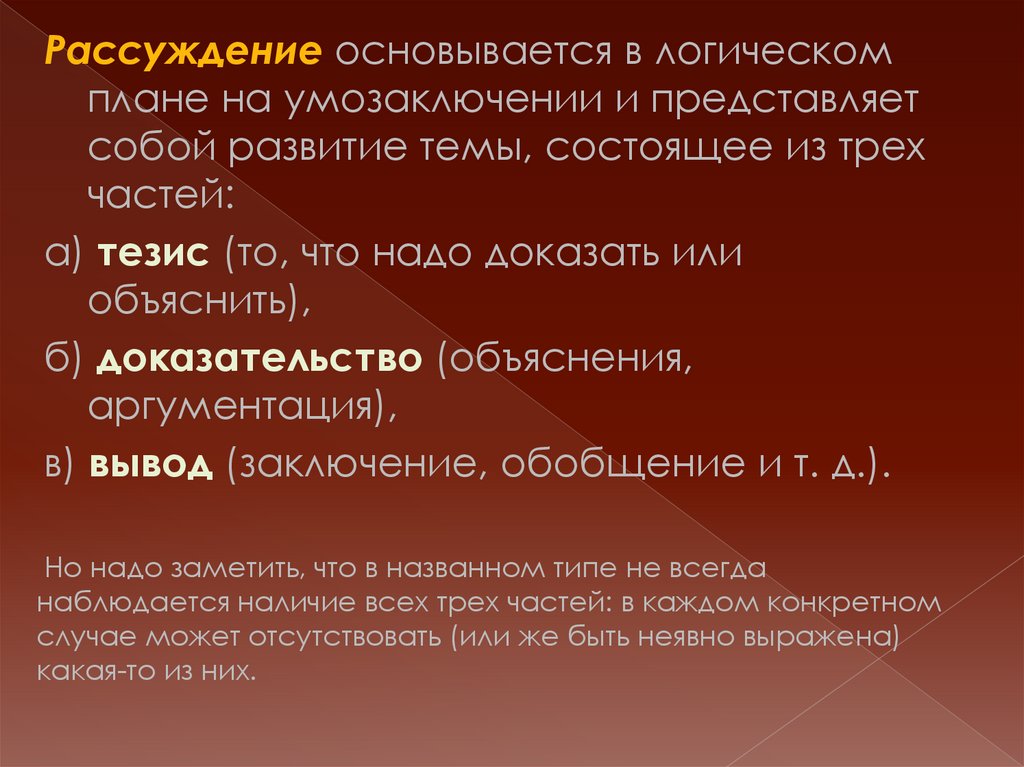 Рассуждение основывается в логическомплане на умозаключении и представляет