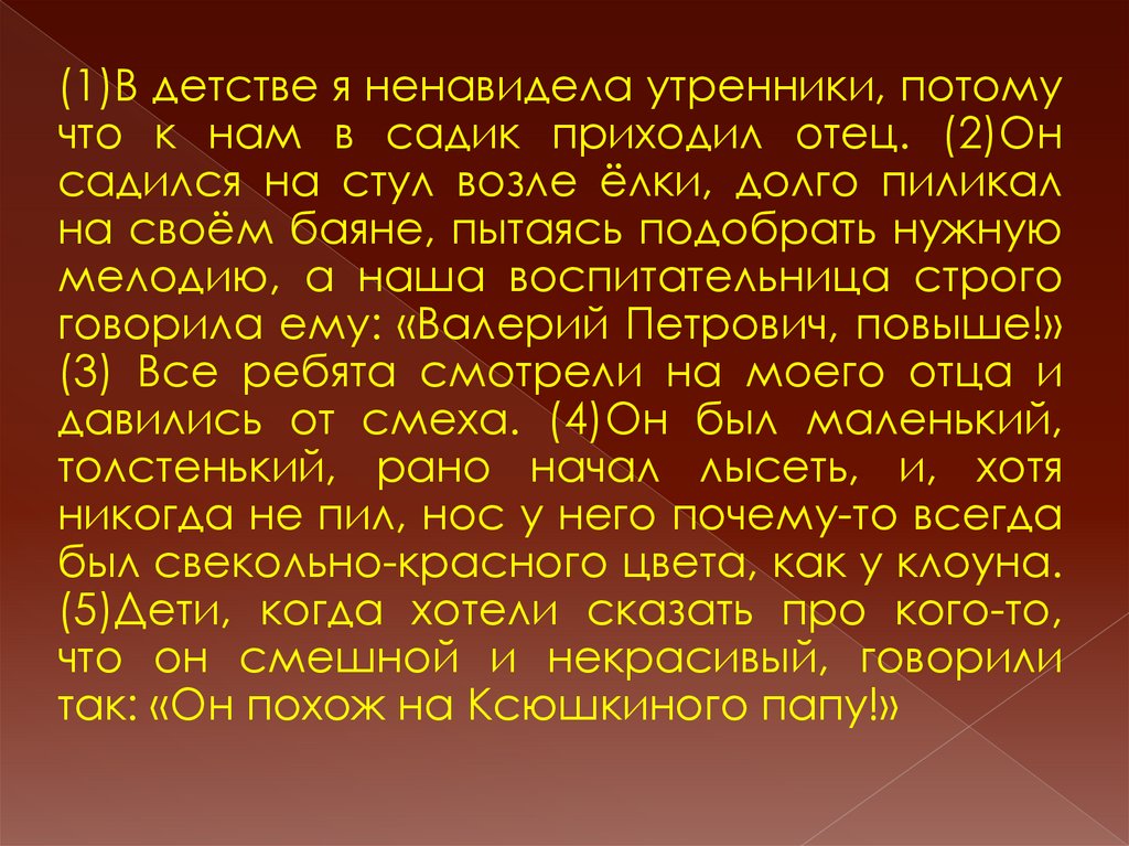 (1)В детстве я ненавидела утренники, потомучто к нам в садик приходил отец. (2)Он