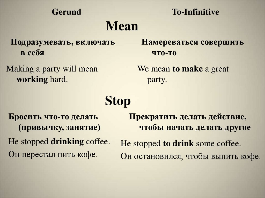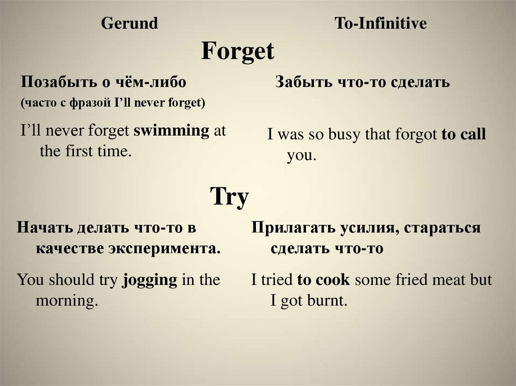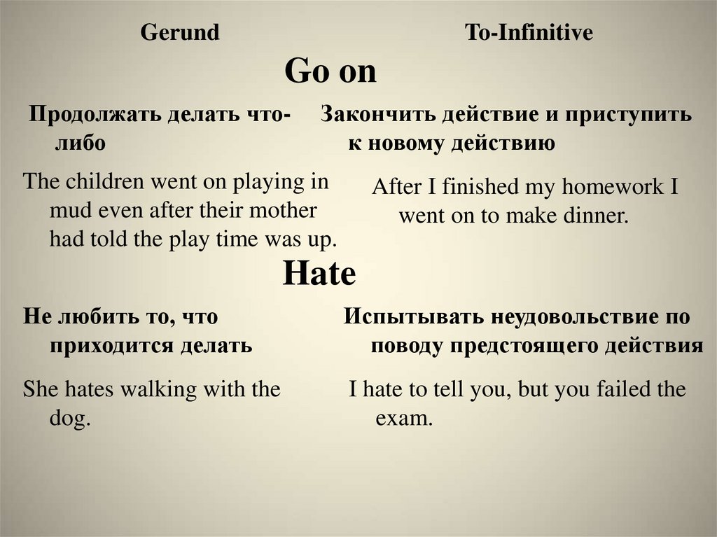 • Глаголы, после которых можно использовать какгерундий так и инфинитив с частицей ‘to’.