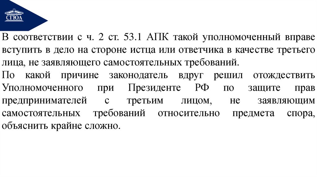 В соответствии с ч. 2 ст. 53.1 АПК такой уполномоченный вправевступить в дело на стороне истца или ответчика в качестве третьего