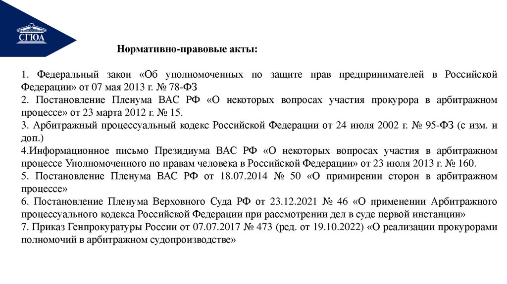 2. Постановление Пленума ВАС РФ «О некоторых вопросах участия прокурора в арбитражном
