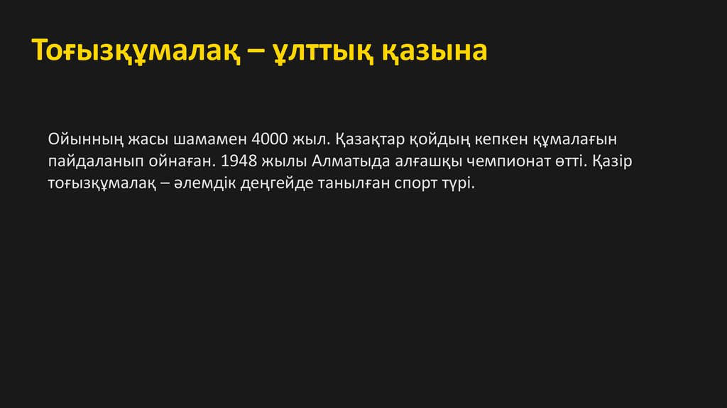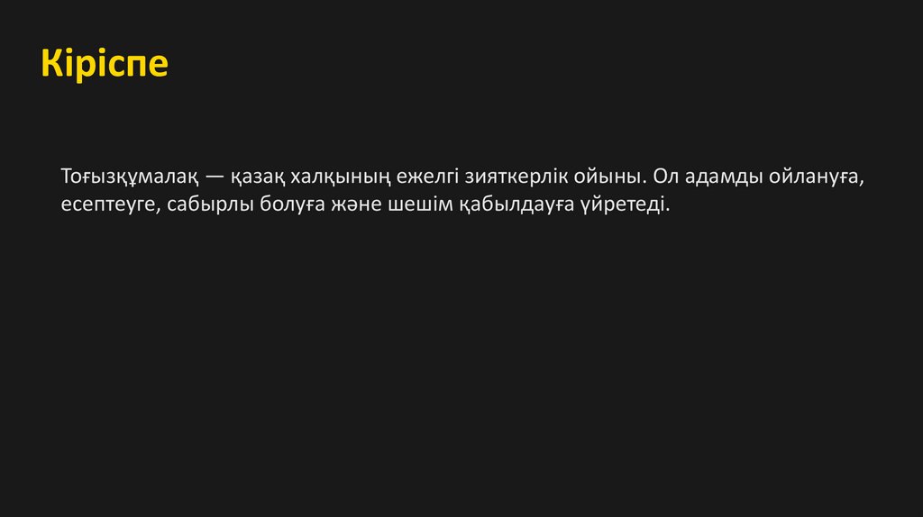 КіріспеТоғызқұмалақ — қазақ халқының ежелгі зияткерлік ойыны. Ол адамды ойлануға,