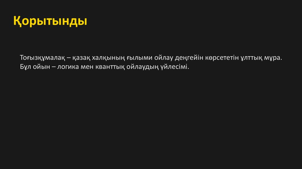 ҚорытындыТоғызқұмалақ – қазақ халқының ғылыми ойлау деңгейін көрсететін ұлттық мұра.