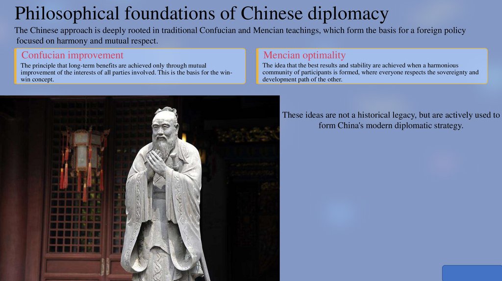 Philosophical foundations of Chinese diplomacyThe Chinese approach is deeply rooted in traditional Confucian and Mencian teachings, which form the basis for a foreign policy
