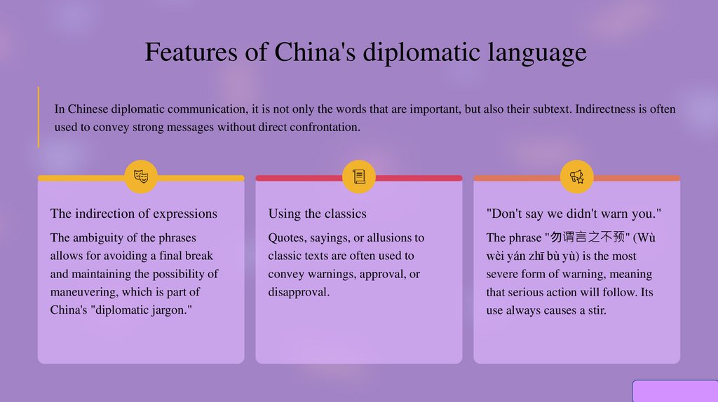 Features of China's diplomatic languageIn Chinese diplomatic communication, it is not only the words that are important, but also their subtext. Indirectness is often