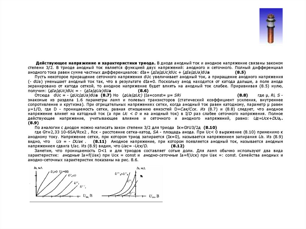 По аналогии с диодом можно написать закон степени 3/2 для триода Iк=GтU3/2д (8.10)