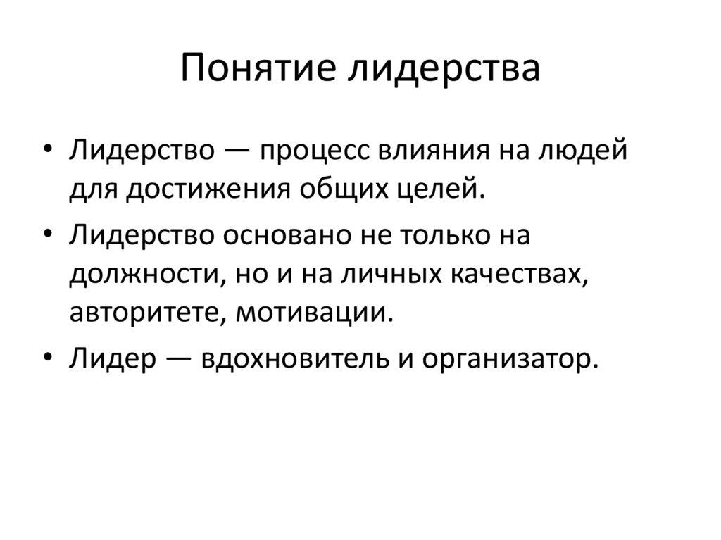 Понятие лидерства• Лидерство — процесс влияния на людей