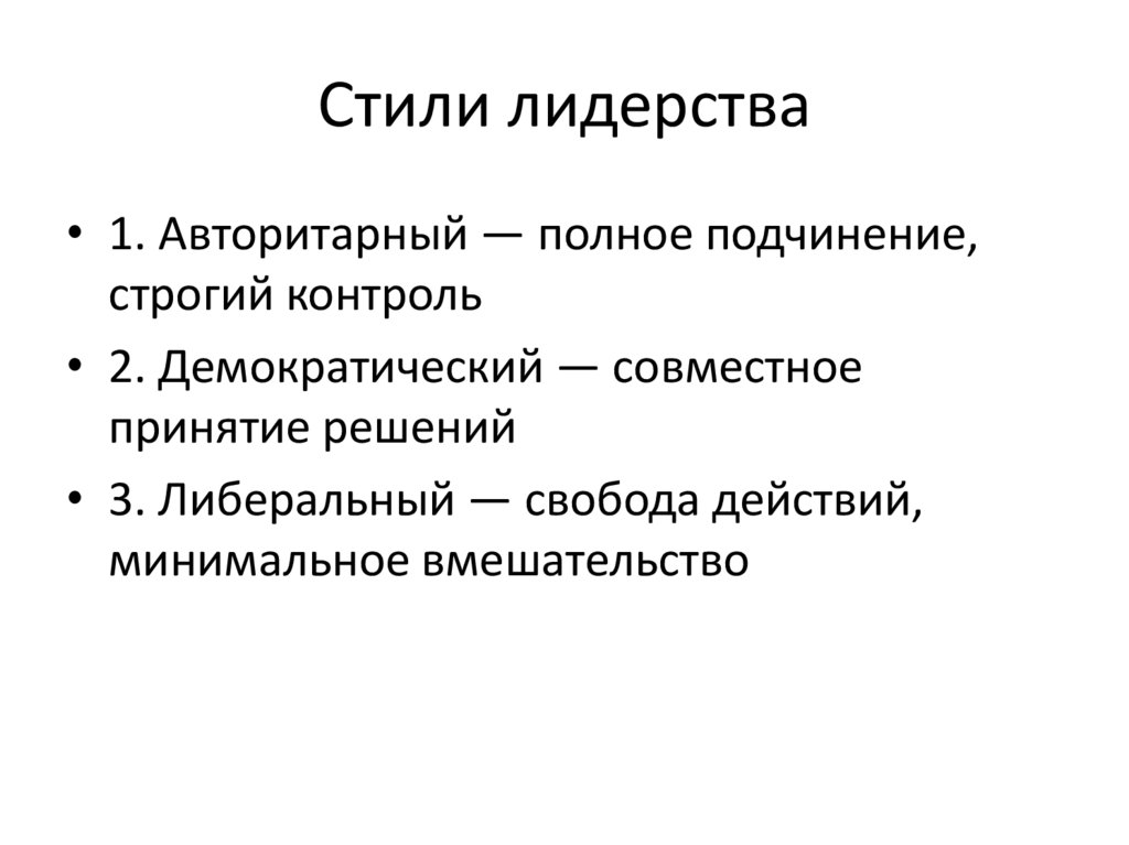 Стили лидерства• 1. Авторитарный — полное подчинение,