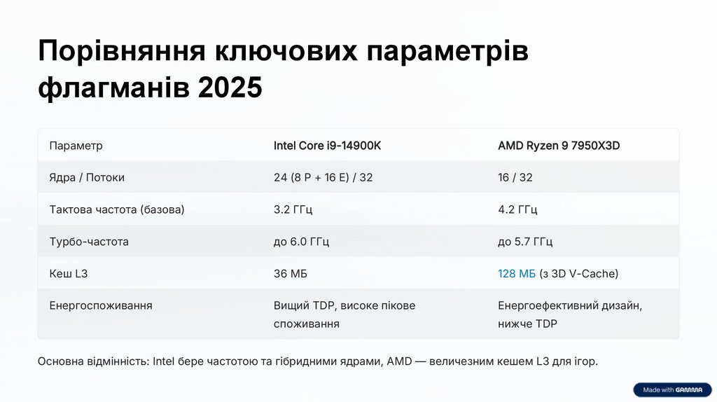 Основна відмінність: Intel бере частотою та гібридними ядрами, AMD — величезним кешем L3 для ігор.