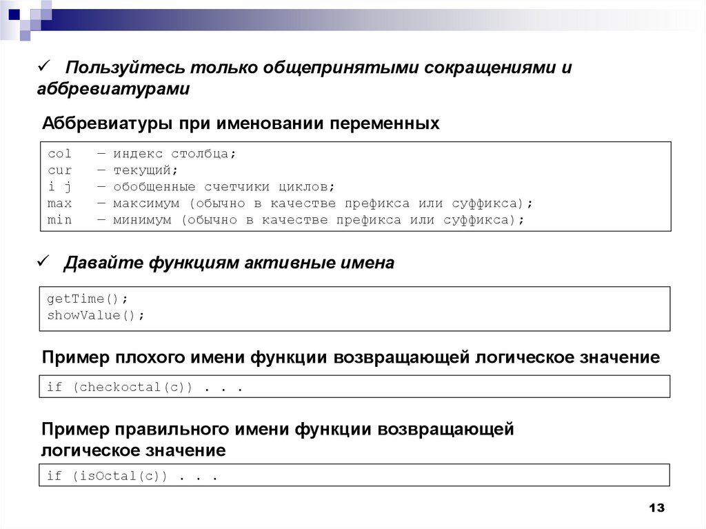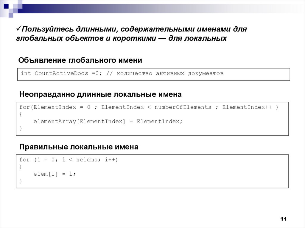 Пользуйтесь длинными, содержательными именами дляглобальных объектов и короткими — для локальных