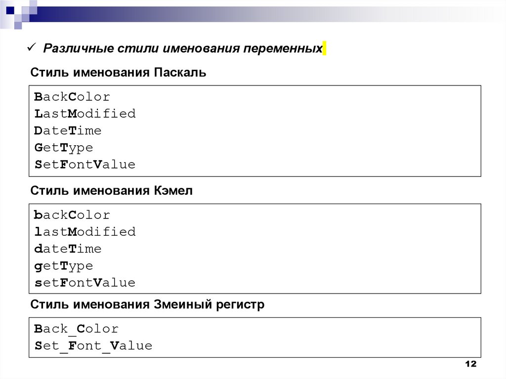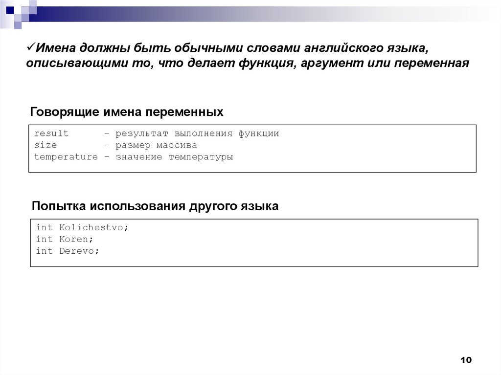 Имена должны быть обычными словами английского языка,описывающими то, что делает функция, аргумент или переменная