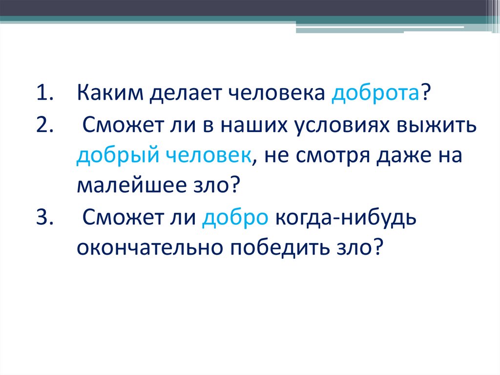 1. Каким делает человека доброта?2. Сможет ли в наших условиях выжить